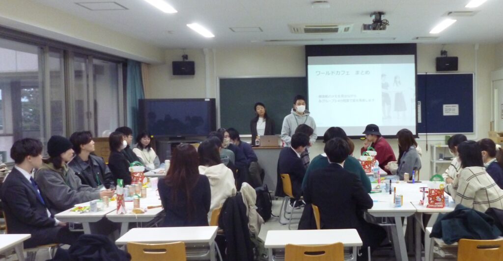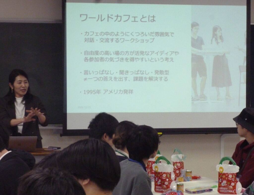 大学側からは石井先生と学生16名、当協会側からは(7社8名)の参加による前回同様ワールドカフェ形式でおこなわれ、クリスマスイブイブということもあり和やかな雰囲気の中、無事終了することができました。